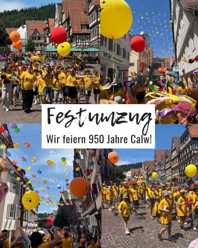 Am vergangenen Samstag, den 05. Juli, wurde es gegen 13 Uhr voll in Calw. Zahlreiche Besucher scharten sich am Marktplatz, der Salzgasse, Lederstraße und am Ende am unteren Ledereck und Brühlplatz. Gespannt warteten alle auf den Festumzug, der zu Ehren des 950. Stadtgeburtstages gefeiert wurde. Auch unsere Schule war natürlich dabei und mit über 100 SchülerInnen, Eltern und Lehrkräften vertreten - ein toller gelber Haufen, der unsere Schule mit Herz repräsentiert und gefeiert hat. Schon von weitem waren wir mit unseren Ballons und unseren lauten Stimmen zu sehen und zu hören - unfassbar, welche Stimmung bei unserem Schlachtruf aufkam!