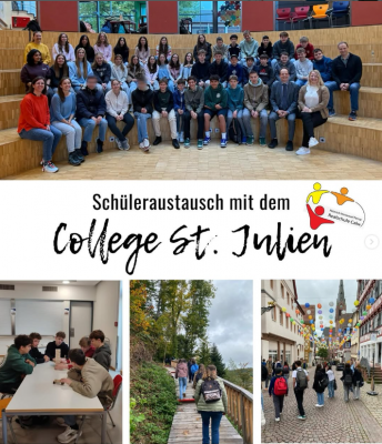Auch in diesem Schuljahr hatten wir wieder Besuch aus Malestroit - und die Franzosen haben bei uns auch viel erlebt und die Region erkundet. Vom Butterstampfen bei den Vogtsbauernhöfen, über das ZKM in Karlsruhe, zum Schloss nach Ludwigsburg, auf den Montescherbelino und zum Flughafen Stuttgart.