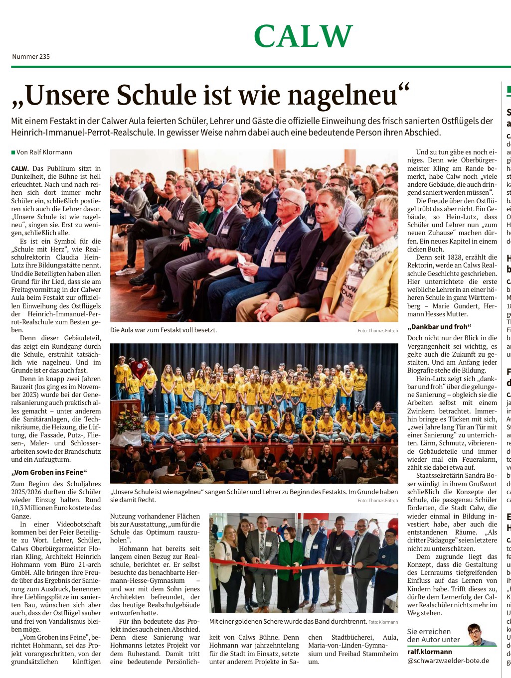 Die Heinrich Immanuel Perrot Realschule Calw lädt zur Einweihungsfeier des neuen G-Gebäudes am 10. Oktober 2025. Zum öffentlichen Teil der Feier wird von 11:00h-13:00h ein buntes, von der Schulgemeinschaft organisiertes Programm geboten sein. Der Elternbeirat sorgt für das leibliche Wohl. Wir freuen uns auf Ihr Kommen!