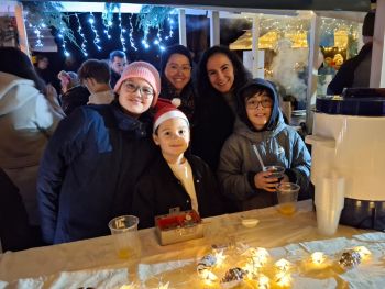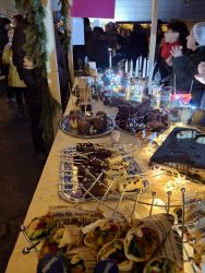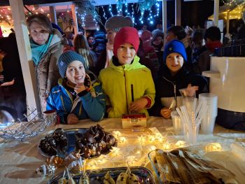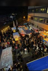 Um 17:00h fiel dann bei perfekten äußeren Bedingungen der Startschuss an den Ständen. Der angekündigte Schnee, der später noch einsetzen sollte, fiel noch nicht, sodass die Schulleitung um Claudia Hein-Lutz und Micha Schmid mit Konfettikanonen und einem Countdown den Markt offiziell eröffneten, beim dem auch für weihnachtliche musikalische Klänge gesorgt war. Tom Lubberger (8a) spielte auf seiner Trompete über den Abend verteilt Weihnachtslieder. Alle Klassen trugen zu einem vielfältigen Angebot bei. Ob Flammkuchen, Hotdogs, Maultaschen-Burger oder Currywurst, ob Schokofürchte, Waffeln, Kaiserschmarrn oder Langos, ob Falafel-Wraps, Gulaschsuppe, Chicken Nuggets oder Pommes – kein Wunsch blieb unerfüllt. Bei einem solchen Angebot kann manch ein Weihnachtsmarkt nicht mithalten! Auch die oben bereits genannten Waren sowie kreative Aktionen wie Kinderschminken oder eine Tombola des Fördervereins sorgten dafür, dass die vielen Besucherinnen und Besucher einen tollen Abend auf dem Schulgelände der HIP-Realschule verbringen konnten, bevor gegen 19:45h mit vielen helfenden Händen der Abbau reibungslos erfolgen konnte. Der Adventsmarkt 2024 war wieder einmal bestens besucht und sorgte für viele strahlende Gesichter, Anlass für viele Gespräche und beste kreative wie kulinarische Auswahl.