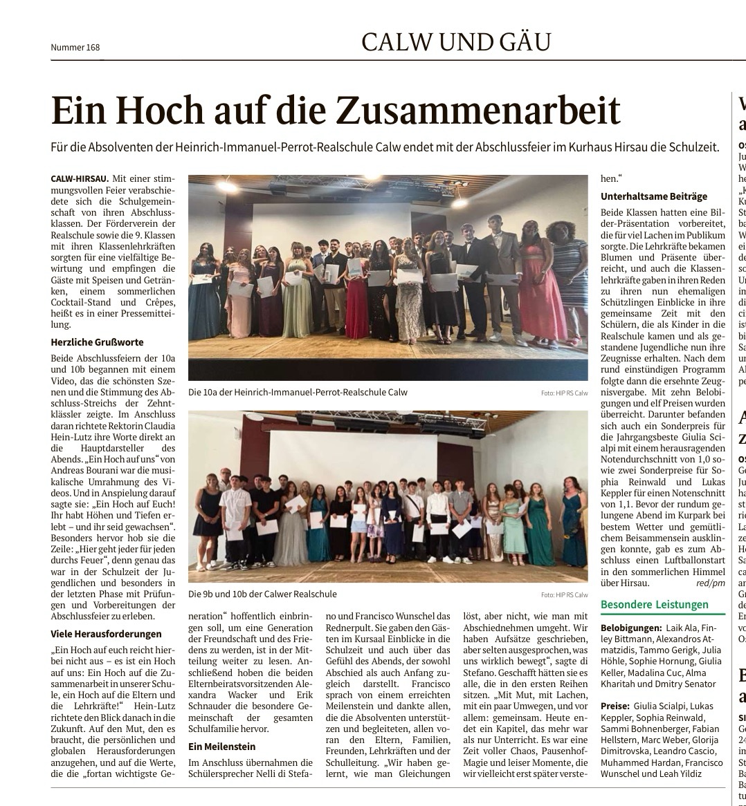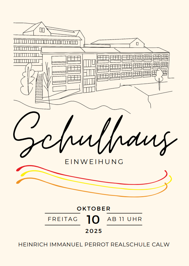 Die Heinrich Immanuel Perrot Realschule Calw lädt zur Einweihungsfeier des neuen G-Gebäudes am 10. Oktober 2025. Zum öffentlichen Teil der Feier wird von 11:00h-13:00h ein buntes, von der Schulgemeinschaft organisiertes Programm geboten sein. Der Elternbeirat sorgt für das leibliche Wohl. Wir freuen uns auf Ihr Kommen!